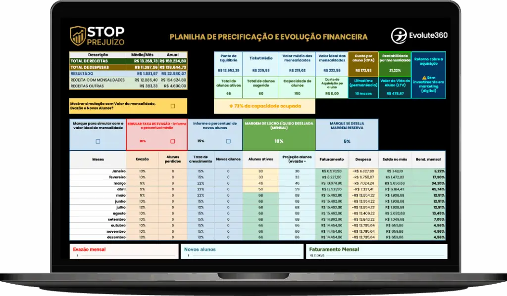 A ferramenta STOP PREJUÍZO é um modelo de apoio à gestão financeira e precificação voltado exclusivamente para academias e estabelecimentos do segmento fitness.